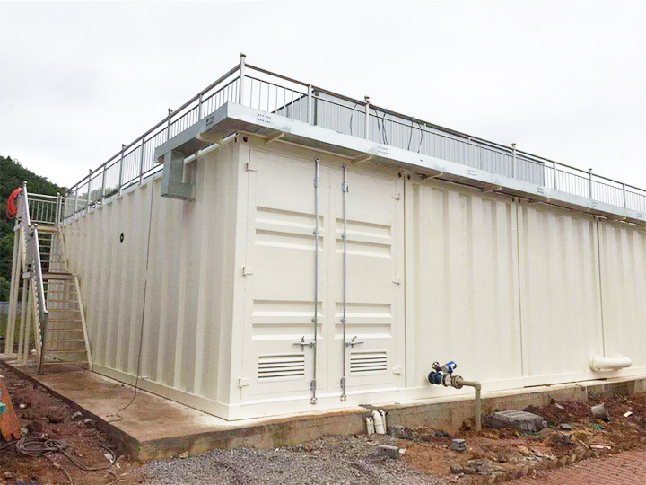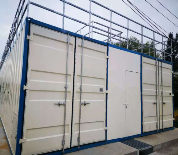 集裝箱式一體化污水凈化設(shè)備的重要部件是膜生物反應(yīng)器(MBR)。污水進(jìn)入MBR系統(tǒng),A區(qū)為兼氧區(qū),放置填料,并與活性污泥進(jìn)行充分接觸;O區(qū)為好氧區(qū),放置膜組器,使用MBR膜將活性污泥和大分子有機(jī)物質(zhì)截留住,省掉二沉池。活性污泥濃度因此提高,水力停留時(shí)間(HRT)和污泥停留時(shí)間(SRT)可以分別控制,而難降解的物質(zhì)在反應(yīng)器中不斷反應(yīng)、降解。進(jìn)一步處理之后,被處理水可以達(dá)標(biāo)排放或回用。此外,輸送到MBR系統(tǒng)中的空氣也是處理過程中重要的一部分,它可以促進(jìn)反應(yīng)器中流體的循環(huán)流動,提高活性污泥的降解效率,還可以使中空纖維膜膜絲之間發(fā)生相互摩擦,清潔膜組件。