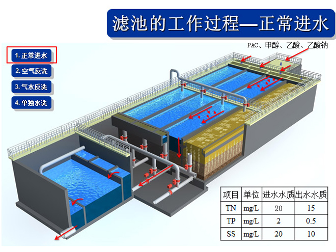 運行模式在外加碳源情況下,則為具有反硝化功能的深床反硝化濾池,可以去除 TN、SS 和 TP。取消外加碳源情況下,則為深床濾池,可以同時去除SS和TP。