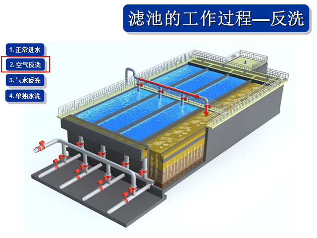 1、氣水聯(lián)合反沖冼裝置、布氣裝置、操作工藝等系統(tǒng)集成技術解決直接過濾、生物濾池生物膜脫落堵塞濾池的問題。