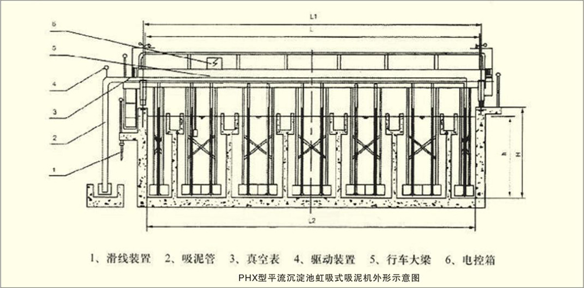 PHX型平流沉淀池虹吸式吸泥機是利用虹吸原理排泥,靠液下泵及水射器抽吸形成虹吸,吸泥機在導軌上往返行走,邊行走,邊吸泥。通過電控系統的指令,主梁兩端的驅動機構同步驅動滾輪,帶動池底集泥裝置,集泥裝置將污泥刮送于各吸泥口,在虹吸作用下連續排出池外??梢滥嗔康亩嗌俅_定排泥的次數。